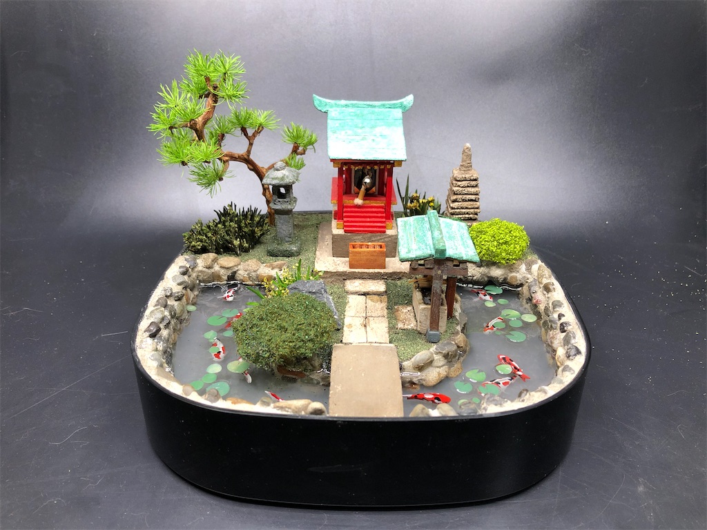 2020-06-25 天祖神社の摂社 箱庭 2年に1度のユザワヤ創作大賞展に向けてコツコツ作っていた箱庭なのですがコロナの影響で開催が未定になってしまいました、コロナは飲食店だけではなく色んな所に影響がでてますね! この作品は地元の氏神様の天祖神社の敷地内にある摂社を元に作りました。 サイズ 幅18cm×奥行18cm×高さ20cmの作品です。